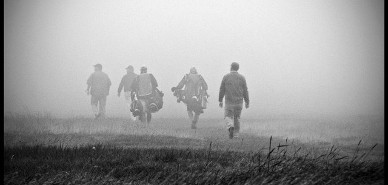 By the time the final grouping had reached the seventeenth hole, the storm was in a fury. The clouds were shredded all across the sky (as they struggled up to their tee shots), ragged strips of blue and black and purple-grey. The storm clouds stretched straight ahead of them, rising to the horizon where lay a strip of light beneath the bruising where you could see the rain falling in sheets. On the eighteenth, they were alone on the course, visitors in an alien land. They stepped out onto the blustery final hole as the rain began falling in earnest--horizontally. By the time the last foursome reached the green, they were soaked. And so, with the wind whipping around their legs, and the rain running in sheets off their rain jackets, they made their way slowly and carefully across the final fairway.