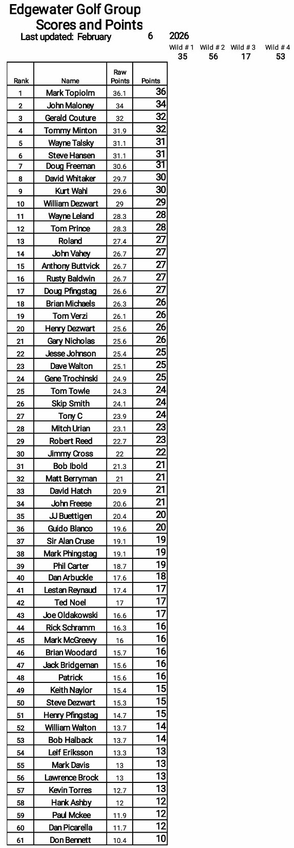 PfingEx Totals and Standings for 2025-26