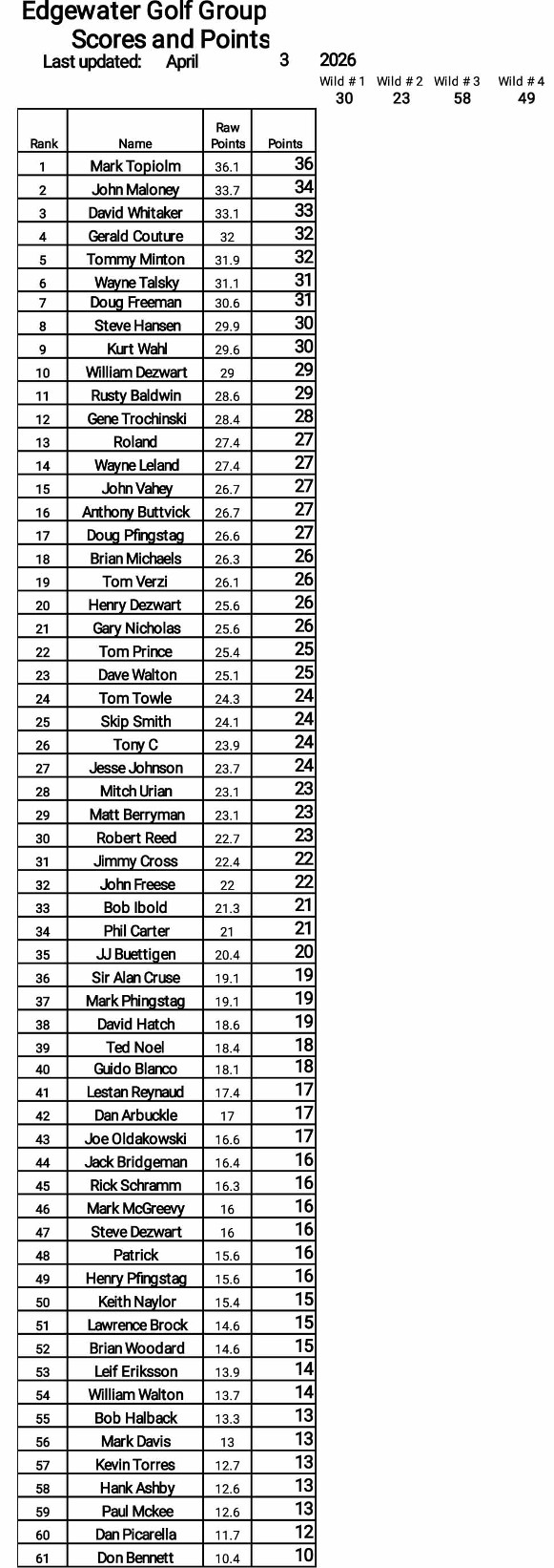 PfingEx Totals and Standings for 2025-26